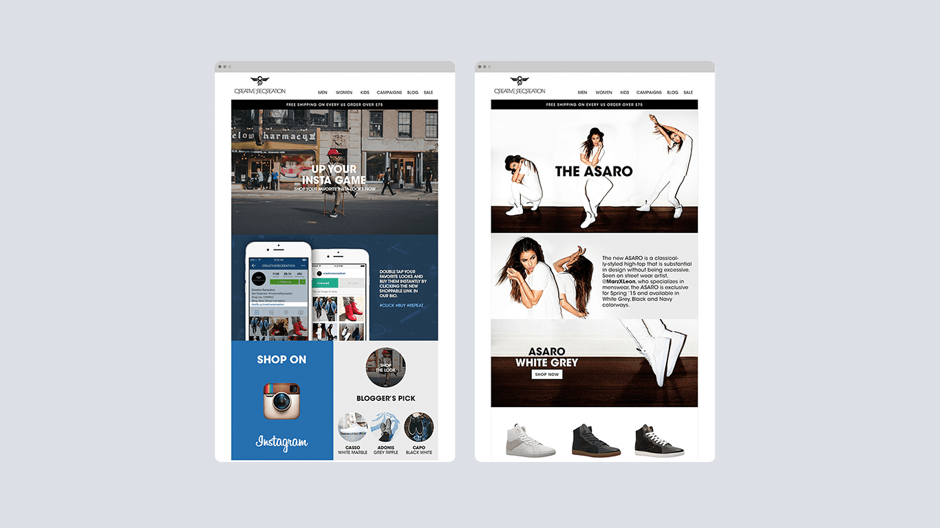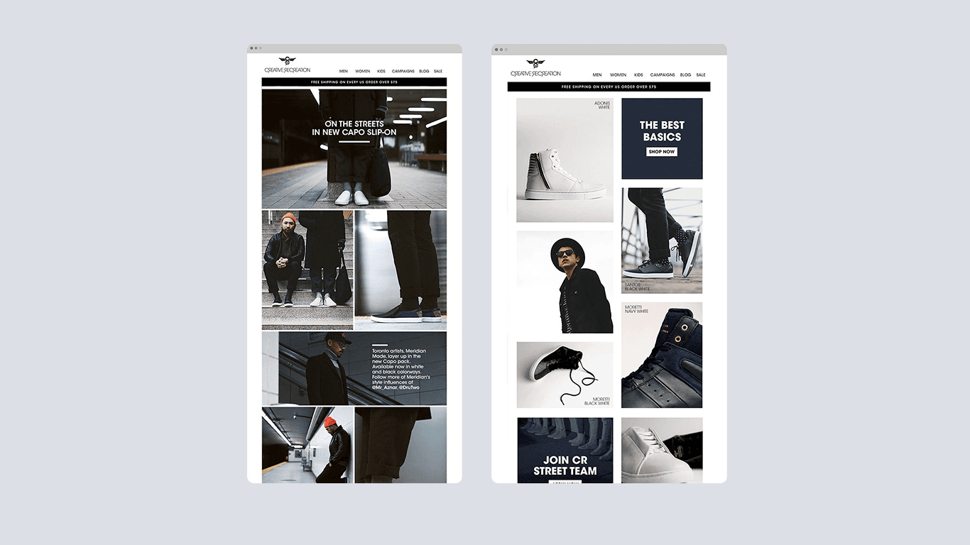 Creative Recreation is an LA-based lifestyle footwear brand. As a lead designer, I designed and executed global brand campaigns across e-commerce, print, advertising, and packaging, ensuring visual consistency across international markets.