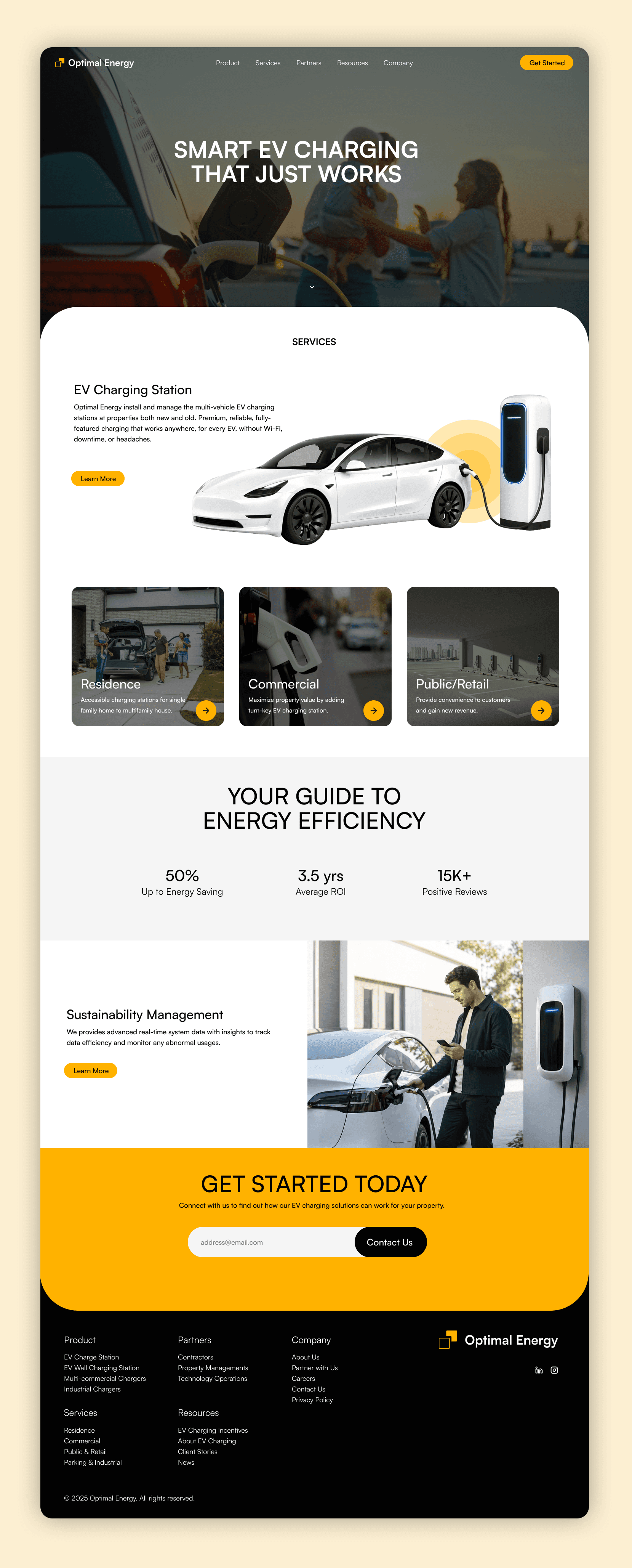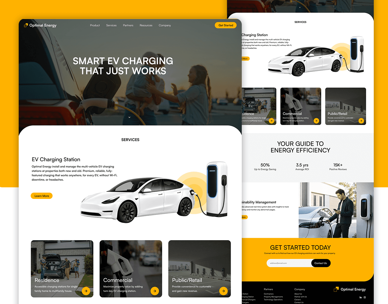 Optimal Energy provides installation and management services for electric vehicle charging stations across residential and commercial sectors. The project focused on redesigning the website to align with an updated brand identity and deliver a more modern, cohesive visual experience.